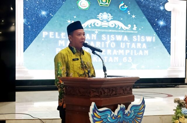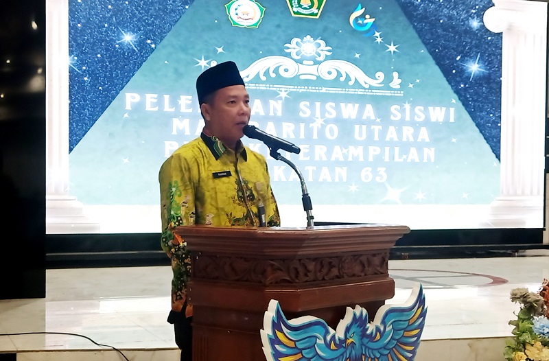 Kepala MAN Barito Utara, Satia Rahman saat memberikan sambutannya pada acara perpisahan Siswa-Siswi MAN Barito Utara Angkatan ke 63 Tahun 2025, yang diselenggarakan di Gedung Balai Antang, Muara Teweh diikuti sebanyak 219 siswa siswi MAN Barito Utara, pada Rabu 9 April 2025.(foto: Theo)