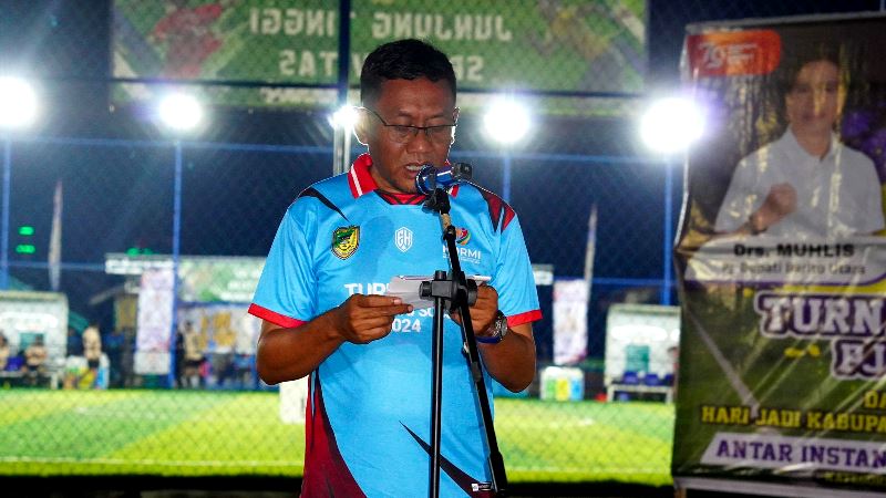 Ketua panitia kegiatan turnamen mini soccer Pj Bupati Barito Utara Cup tahun 2024, Ari Sucianto sampaikan laporan kegiatan turnamen pada pembukaan, Minggu 11 Agustus 2024 di lapangan mini soccer Lapangan Hijau Muara Teweh.(foto: Theo)