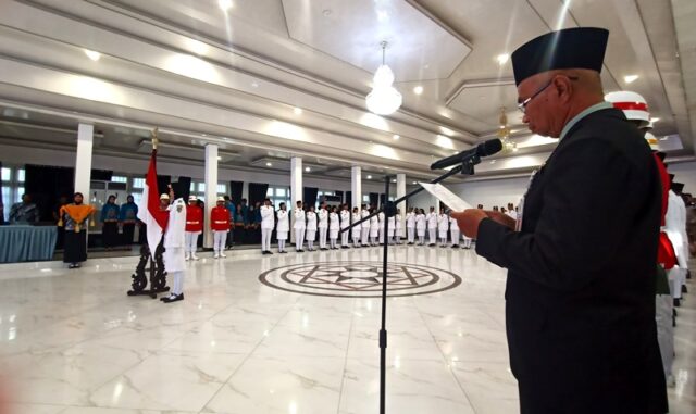 LINTASKABAR24, Muara Teweh – Sebelum dikukuhkan oleh Pj Bupati Barito Utara Drs Muhlis, terlebih dahulu anggota Pasukan Pengibar Bendera Pusaka (Paskibraka) Kabupaten Barito Utara tahun 2024 membacakan ikrar anggota Paskibraka.