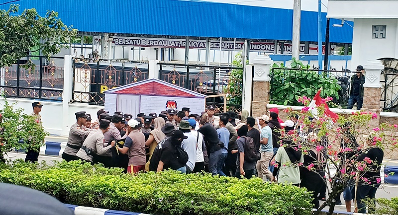 Salah satu adegan dalam pelaksanaan Sispamkota dalam rangka pengamanan jelang putusan MK PSU Barito Utara di depan gedung balai Antang dan kantor Bupati.(foto: Theo)