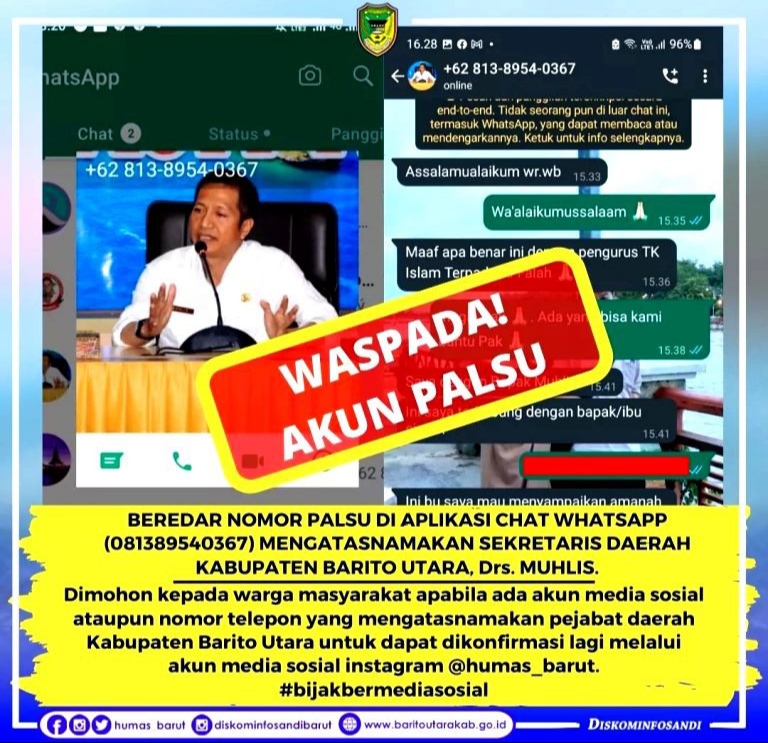 Sekda Kabupaten Barito Utara Muhlis menegaskan, kepada para Aparatur Sipil Negara (ASN) dan masyarakat untuk tidak mudah percaya akan rayuan pelaku penyalahgunaan WhatsApp yang mengatasnamakan Sekda ataupun pejabat lainnya.
