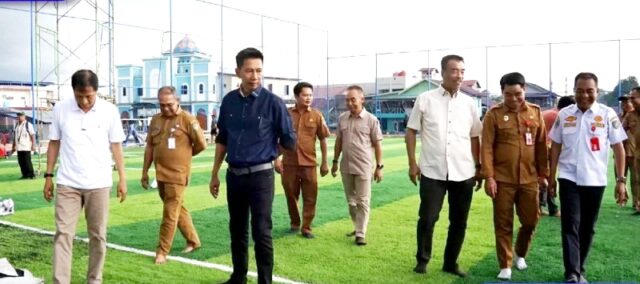 LINTASKABAR24, Muara Teweh – Bupati Barito Utara H Nadalsyah bersama Wakil Bupati Barito Utara Sugianto Panala Putra, Sekretaris Daerah Drs Muhlis, Kalak BPBD, Kepala Dinas Perhubungan, Sekretaris Dinas PUPR meninjau progres pembangunan lapangan Mini Soccer yang akan menjadi kebanggaan Barito Utara, Senin 11 September 2023.