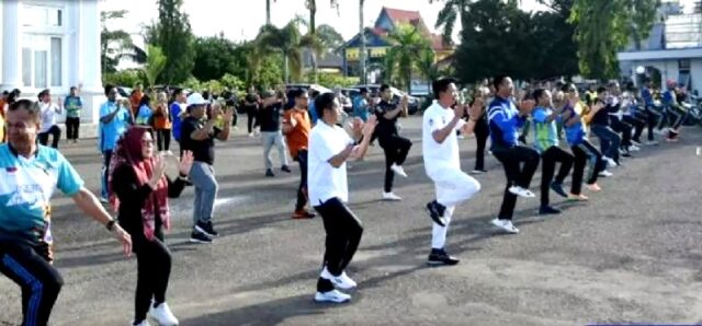 Ket foto : Bupati H Nadalsyah, Wakil Bupati Sugianto Panala Putra dan Sekda Muhlis senam bersama kepala perangkat daerah di lingkup Pemkab setempat, di halaman rumah jabatan bupati, Jumat 28 April 2023.(foto: Theo)