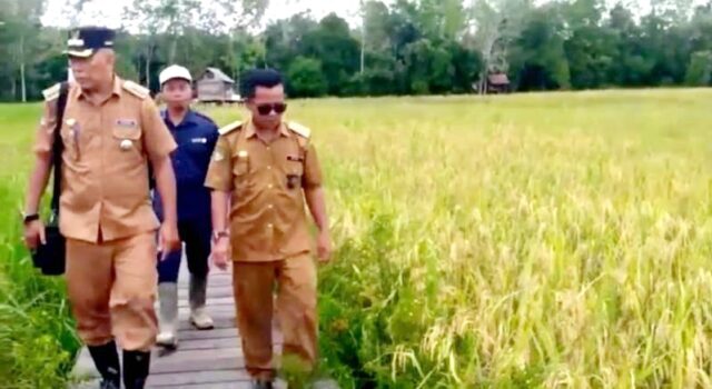 LINTASKABAR24, Muara Teweh –Camat Teweh Selatan, Sodiq bersama Kepala Desa Bintang Ninggi II Ardianto, Ketua dan anggota BPD dan seluruh perangkat Desa Bintang Ninggi II melakukan peninjauan lokasi atau lahan tanaman padi kelompok tani “Maju Mufakat”, di Desa Bintang Ninggi II.