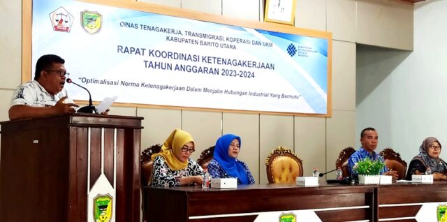 LINTASKABAR24, Muara Teweh – Dinas Tenaga Kerja, Transmigrasi, Koperasi dan UKM (Disnakertranskop UKM) Kabupaten Barito Utara melaksanakan Rapat Koordinasi (Rakor) Ketenagakerjaan di aula Kecamatan Teweh Tengah.