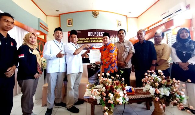 LINTASKABAR24, Muara Teweh – Ketua Dewan Pimpinan Cabang (DPC) Partai Gerakan Indonesia Raya (Gerindra) Kabupaten Barito Utara, H Tajeri bersama Sekretaris Gerindra Mustafa Joyo Muhtar menyerahkan berkas daftar bakal calon legislatif (Bacaleg) DPRD Barito Utara ke Komisi Pemilihan Umum (KPU) Barito Utara, Sabtu 13 Mei 2023 sekitar pukul 13.00 WIB.