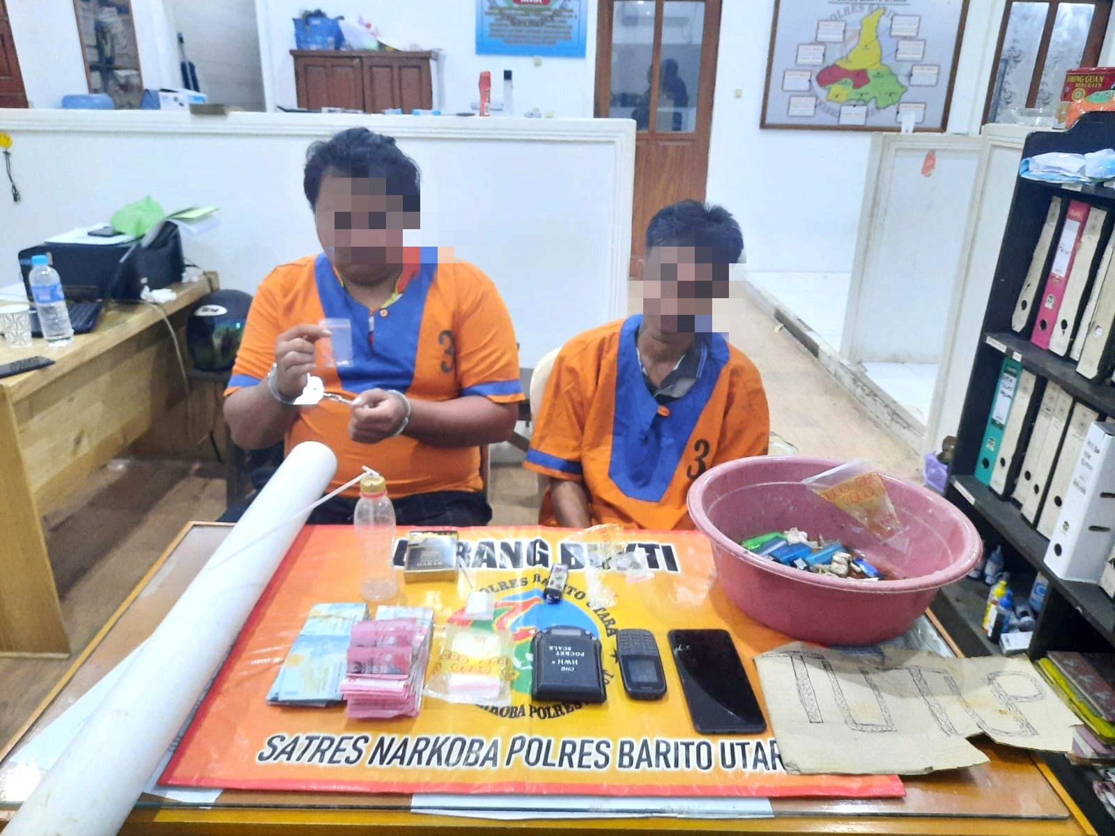 Kedua pelaku bersama barang bukti satu buah plastik klip kecil bening berisi serbuk kristal putih yang diduga narkotika jenis shabu dengan berat total 0,55 (nol koma lima lima) gram brutto, satu buah bungkus rokok Surya 16 warna coklat, dua bungkus plastik klip kosong.