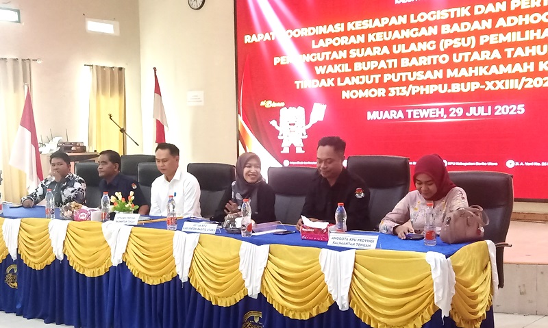 LINTASKABAR24, Muara Teweh – Ketua KPU Provinsi Kalimantan Tengah, Sastriadi secara resmi membuka kegiatan Rapat Koordinasi Kesiapan Logistik dan Pertanggungjawaban Keuangan Badan AdHoc dalam rangka Pemungutan Suara Ulang (PSU) Pemilihan Bupati dan Wakil Bupati Barito Utara tahun 2024, sebagai tindak lanjut Putusan Mahkamah Konstitusi Nomor 313/PHPU.BUP-XXIII/2025. Kegiatan ini berlangsung di Aula Bappedalitbang Barito Utara, Selasa 29 Juli 2025.