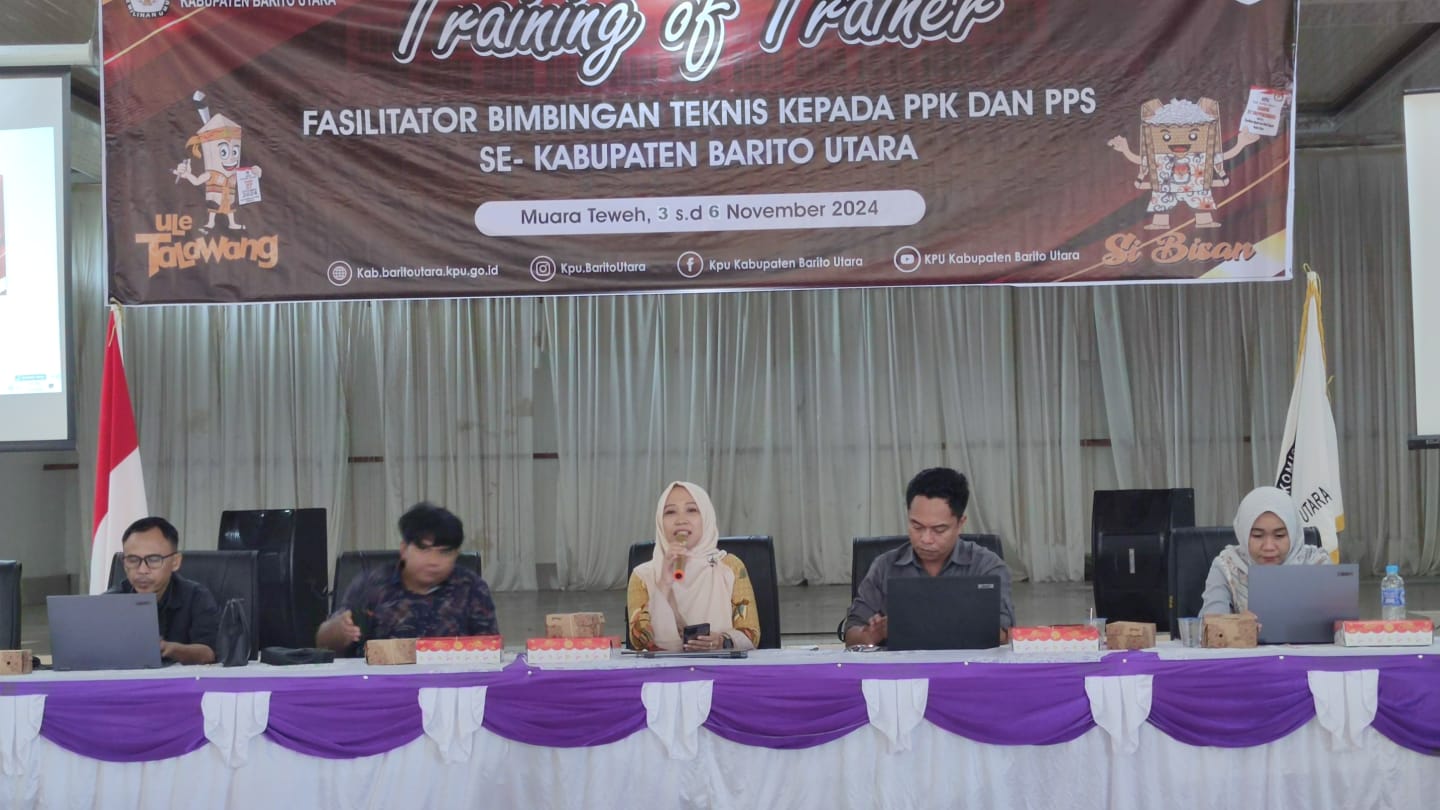 LINTASKABAR24, Muara Teweh – Komisi Pemilihan Umum (KPU) Kabupaten Barito Utara melaksanakan Training of Trainer (ToT) kepada PPK dan PPS se-Kabupaten Barito Utara di Aula Barakati Tepian Kolam, Jalan Pramuka Muara Teweh yang digelar selama 4 hari terhitung sejak 3 hingga 6 November 2024 yang terbagi dalam 3 gelombang.