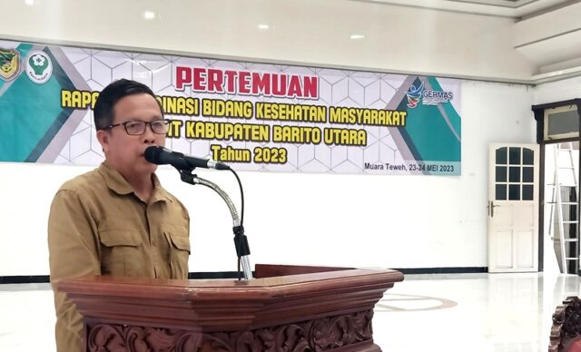 Ket foto : Kepala Dinas Kesehatan Barito Utara, Drs H Hajrannor saat membuka kegiatan Rakor bidang kesehatan masyarakat di gedung Balai Antang Muara Teweh, Selasa 23 Mei 2023.(foto: Theo)