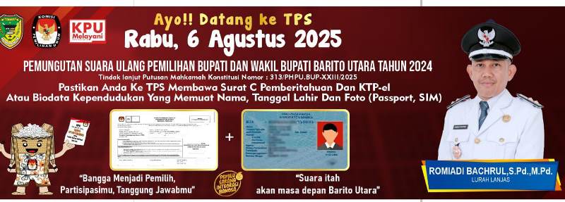 LINTASKABAR24, Muara Teweh – Menyambut Pemungutan Suara Ulang (PSU) Pemilihan Bupati dan Wakil Bupati Barito Utara Tahun 2024, Lurah Lanjas, Romiadi Bachrul, S.Pd., M.Pd., mengimbau seluruh warga Kelurahan Lanjas untuk datang ke Tempat Pemungutan Suara (TPS) dan menggunakan hak pilihnya pada hari Rabu, 6 Agustus 2025.
