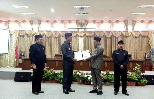 Ket foto : Wakil Ketua I DPRD Parmana Setiawan didampingi Wakil Ketua II DPRD Sastra Jaya menyerahkan 3 raperda inisiatif dewan kepada Wakil Bupati Barito Utara pada sidang paripurna.(foto: Theo)