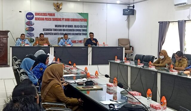 LINTASKABAR24, Muara Teweh – Pemerintah Kabupaten Barito Utara melaksanakan rapat konsultasi publik rencana pasca tambang PT Bumi Kurnia Pertiwi (BKP) yang berlokasi di Desa Panaen Kecamatan Teweh baru dan Desa Pelari Kecamatan Gunung Timang, di aula Setda lantai I, Senin 27 Mei 2024.