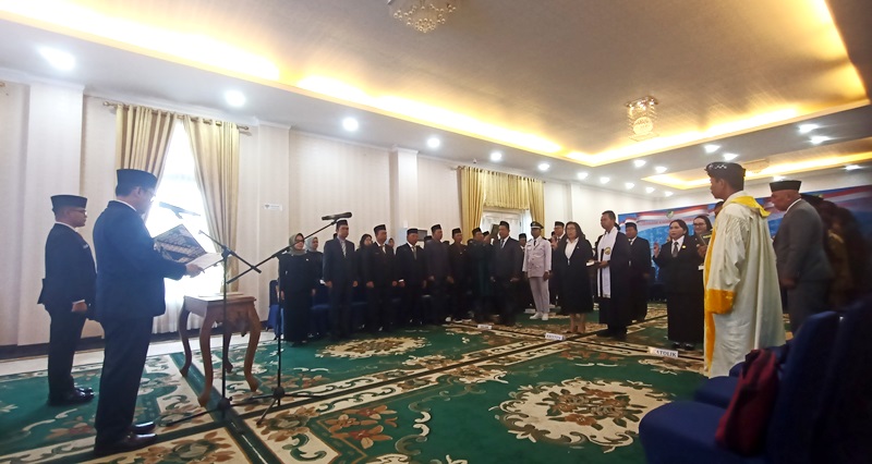Pj Bupati Barito Utara, Indra Gunawan secara resmi melantik dan mengambil sumpah janji jabatan pejabat administrator, pejabat pengawas, PAW Kades Muara Wakat, serta PAW Ketua BPD dari delapan desa yaitu Benangin I, Benao Hulu, Jangkang Baru, Teluk Malewai, Berong, Pelari, dan Malawaken, di aula Rujab Bupati, Senin 28 Juli 2025.(foto: Theo)