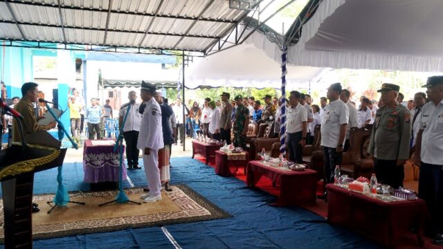 Pj Bupati Barito Utara, Drs Muhlis saat melantik dan mengambil sumpah janji jabatan Kepala Desa PAW Bintang Ninggi II, Taufikurrahman di halaman kantor desa setempat, Rabu 22 Mei 2024.(foto: Theo)
