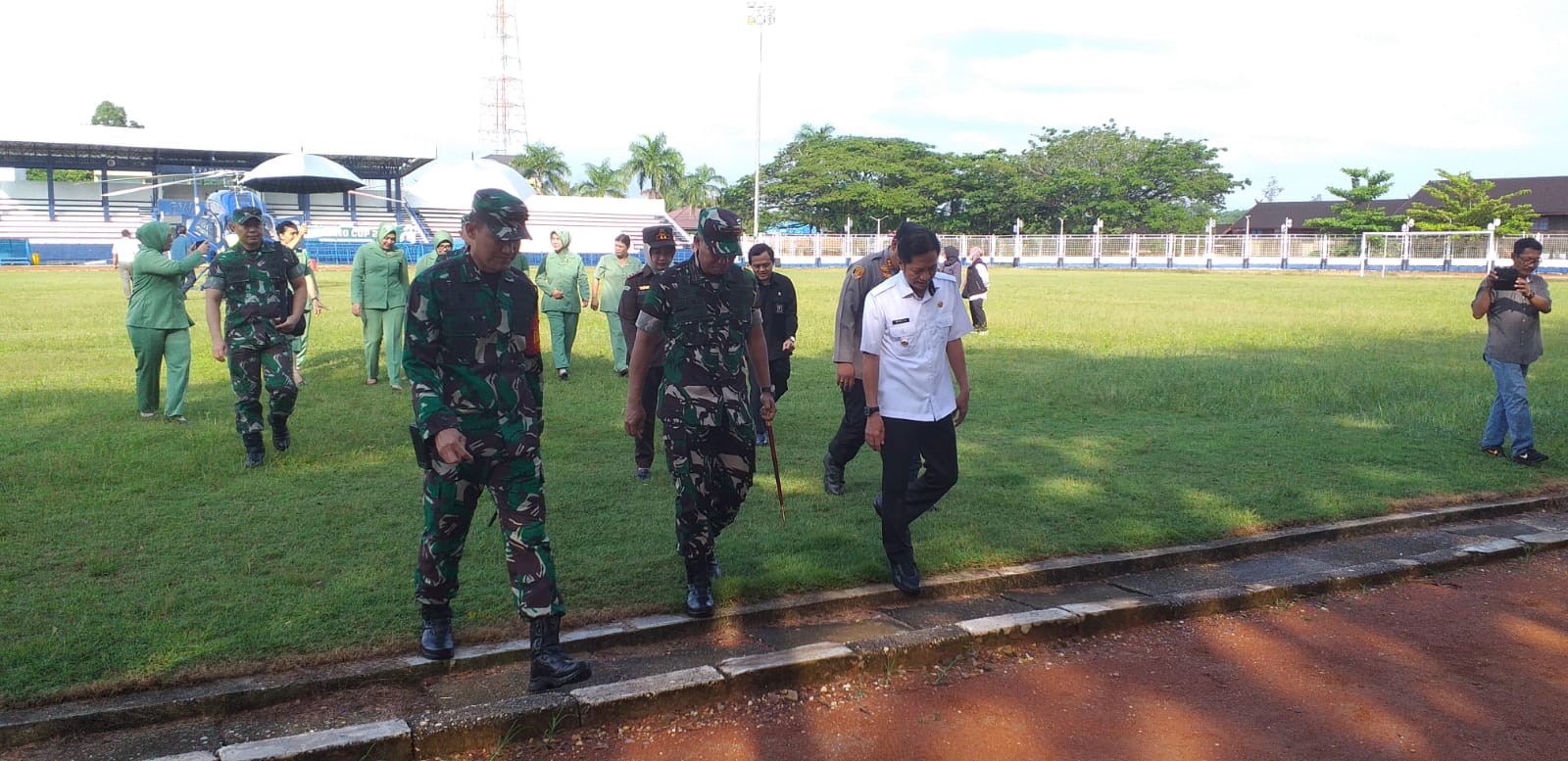Disambut di Stadion Swakarya Muara Teweh Danrem 102/Panju Panjung beserta rombongan menuju Makodim 1013/Muara Teweh untuk mendengarkan paparan Dansatgas TMMD sekaligus bersilaturahmi dengan unsur FKPD Kabupaten Barito Utara.