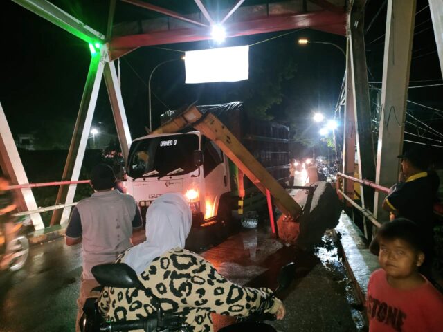 Ket foto : Sebuah truk tabrak palang/portal jembatan Paringin pada Selasa 3 Januari 2022.(foto: MG1)